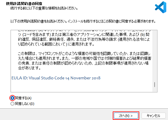 実行すると使用許諾契約書の同意を求められます。同意できない場合は次に進めることができないので、よく読んでから問題がなければ「同意する」にチェックして「次へ」をクリックします。