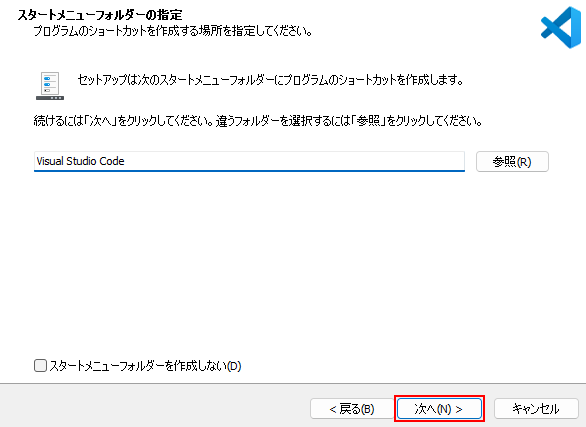 「スタートメニューフォルダーの設定」では、Windowsのスタートメニューにショートカットを作成するか選択できます。必要がなければ「スタートメニューフォルダを作成しない」にチェックを入れます。お好みで選択してください。
