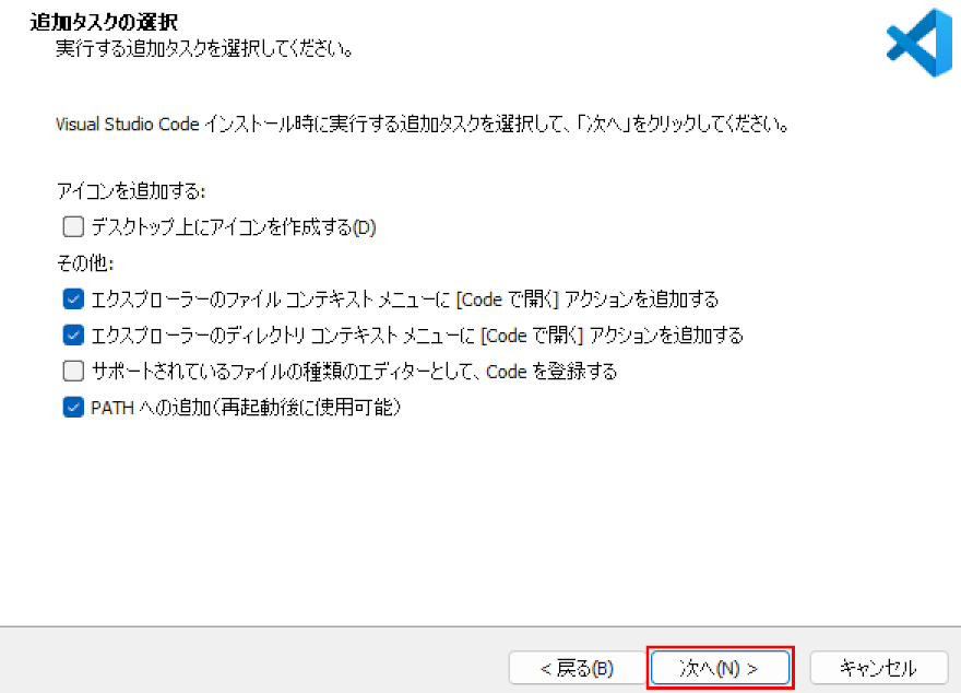 「PATHへの追加(再起動後に使用可能)」にチェックを入れると、コマンドプロンプトやPower ShellといったコマンドラインからVSCodeを実行することができるようになります。コマンドラインはプログラミングを学ぶ上で必要不可欠なのでチェックすることをオススメします。