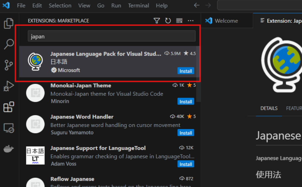 検索結果にはいろんな拡張機能が表示されますが、結果の上部に「Japanese Language Pack for Visual Studio Code」の項目があります。拡張機能の説明を読みたい場合は「Install」ボタン以外の領域をクリックすると表示されます。「Install」ボタンをクリックするとインストールが開始され、拡張機能がVSCode上にインストールされます。