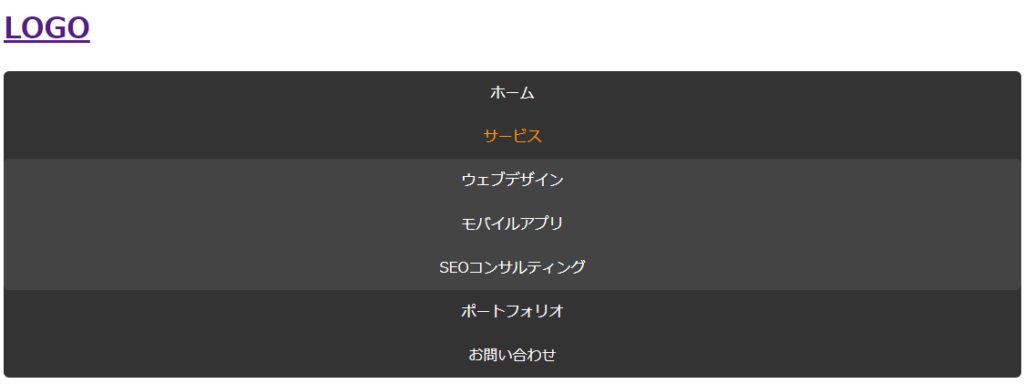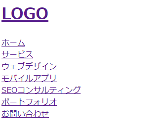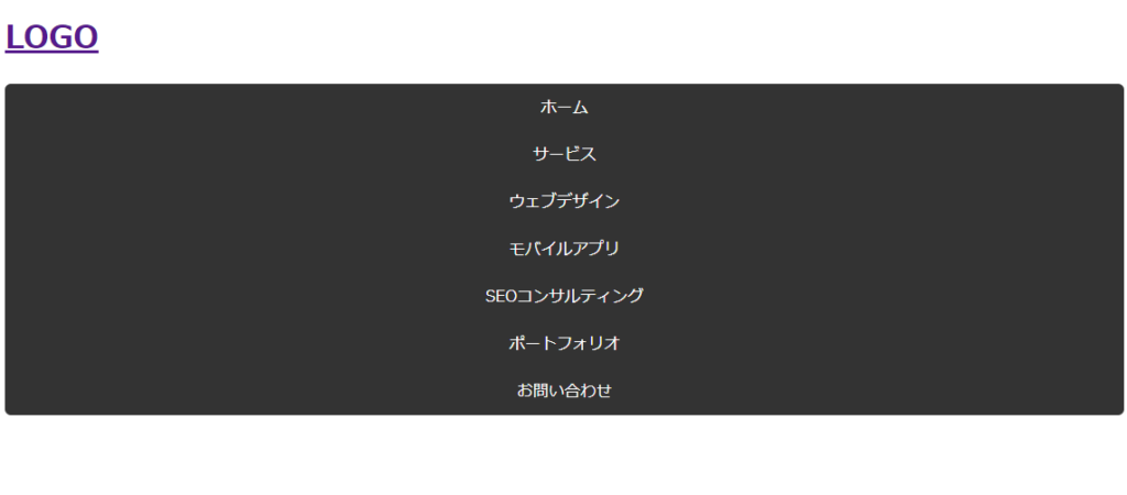 ナビゲーションメニューの基本的なHTML構造が完成しました。ウェブブラウザで表示すると以下のようになります。
