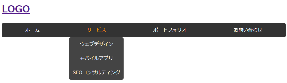 トップレベルのメニューとして、「ホーム」、「サービス」、「ポートフォリオ」、「お問い合わせ」があり、「サービス」は更に「ウェブデザイン」、「モバイルアプリ」、「SEOコンサルティング」のカテゴリーに分類されています。