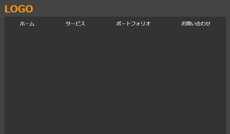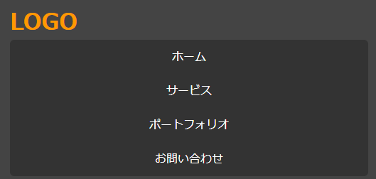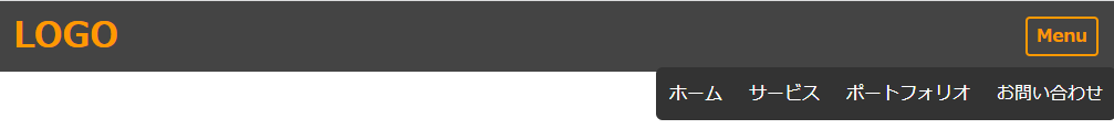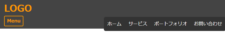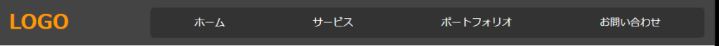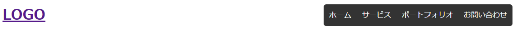まずはheader要素にサイトロゴとトップレベルの「ホーム」、「サービス」、「ポートフォリオ」、「お問い合わせ」のメニューをマークアップします。以下がナビゲーションメニューのHTMLの例です。