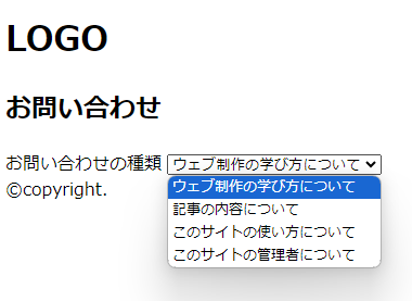 - お問い合わせの種類を select 要素と option 要素で定義